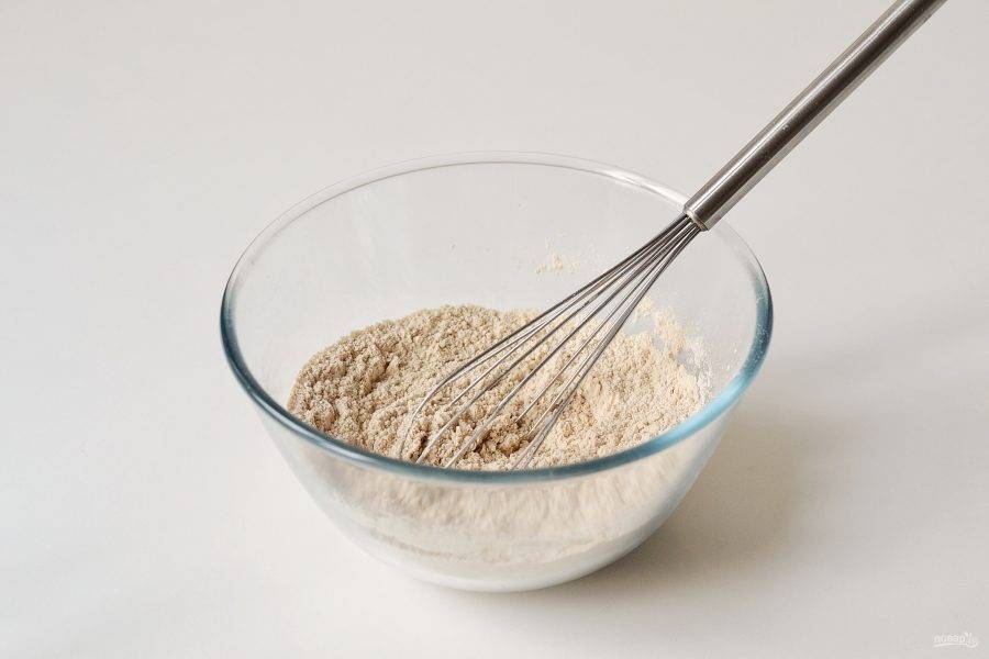 Смешайте оба вида муки, сахар и соль.