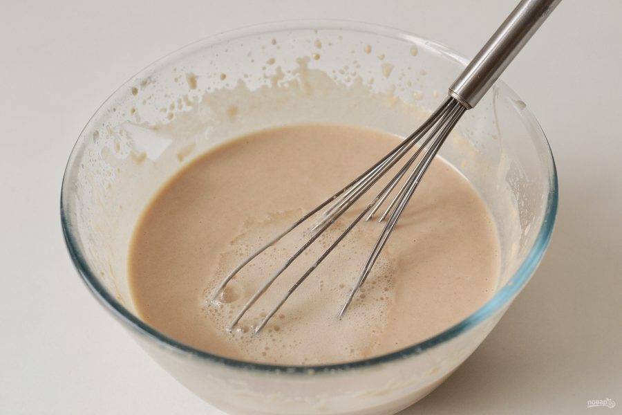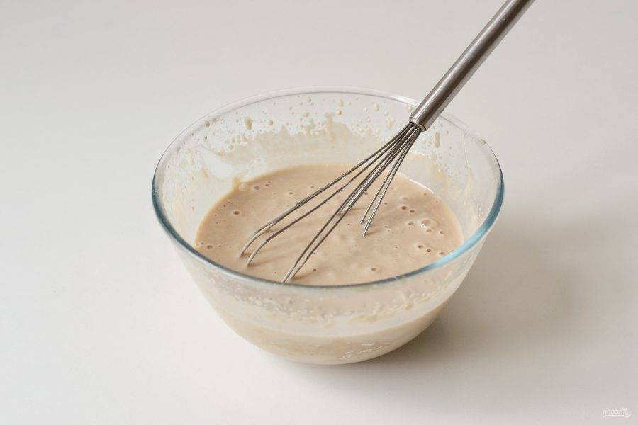 Постепенно влейте воду, постоянно помешивая венчиком. Затем добавьте растительное масло. Оставьте тесто на 10 минут.