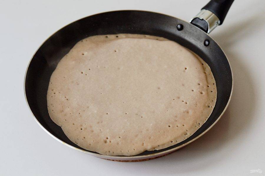 Разогрейте сковороду, смажьте маслом и жарьте блинчики до золотистого цвета. С одной стороны жарьте 2-3 минут, с другой чуть меньше.