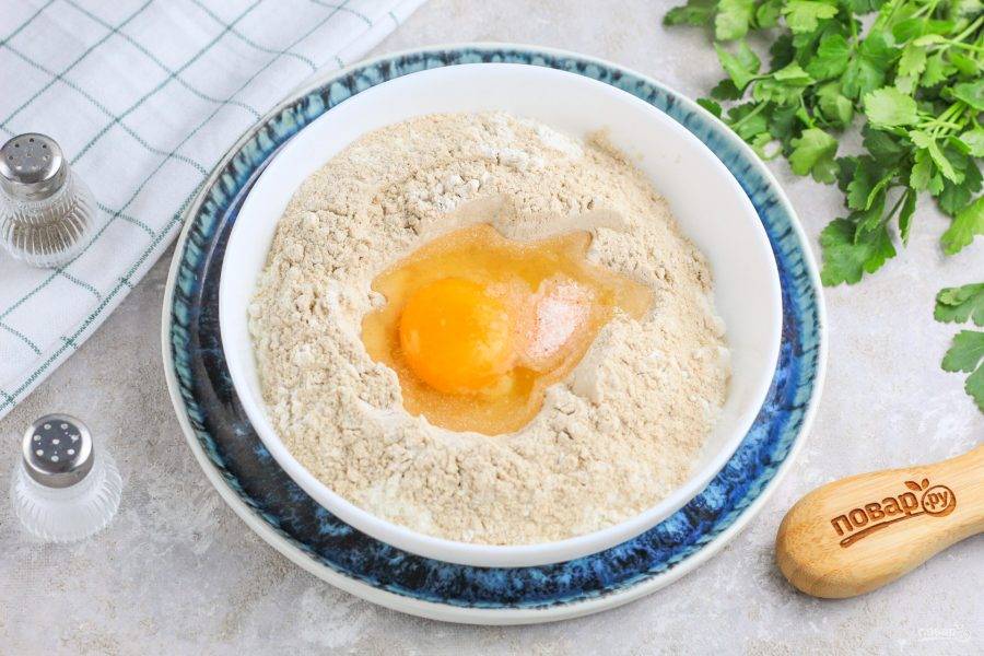 Соедините гречневую и пшеничную муку и треть массы оставьте на раскатку. Остальную массу высыпьте в глубокую емкость и сделайте в ней углубление. Всыпьте туда соль и вбейте куриное яйцо.