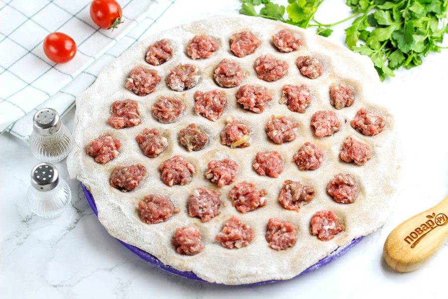 Затем разделите тесто на равные части и раскатайте каждую из них в округлый пласт. Имейте в виду, что тесто из гречневой муки более мягкое и рыхлое, поэтому тщательно припыливайте поверхность мукой. Не раскатывайте его слишком тонко, так как оно порвется. Присыпьте мукой пельменницу, выложите на нее тесто и в отверстия выложите мясной фарш.