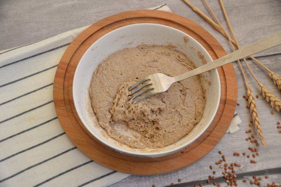 Добавьте в миску 100 граммов ржаной цельнозерновой муки, смешайте. Накройте пищевой пленкой, оставьте на 8-10 часов для брожения при комнатной температуре.