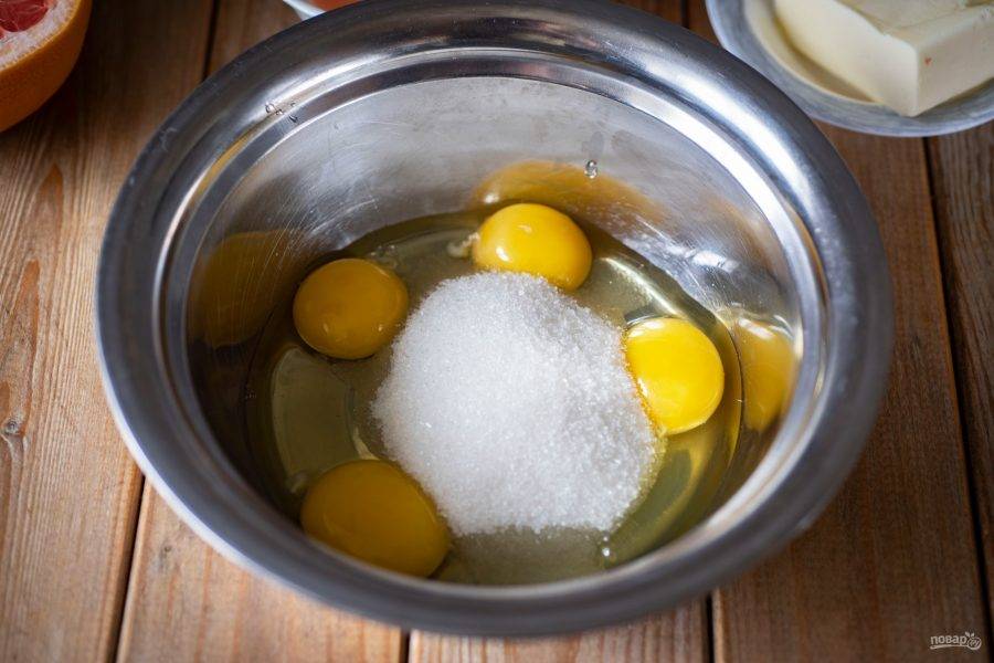 В просторную миску вбейте 2 яйца и добавьте еще 2 куриных желтка, отделив их аккуратно у двух других яиц. К яйцам добавьте сахар.