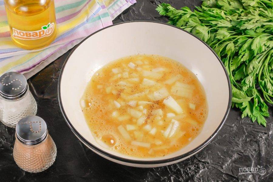 Репчатый лук нарежьте мелкими кубиками и выложите нарезку во взбитую яичную массу. Всыпьте молотый черный перец и перемешайте.