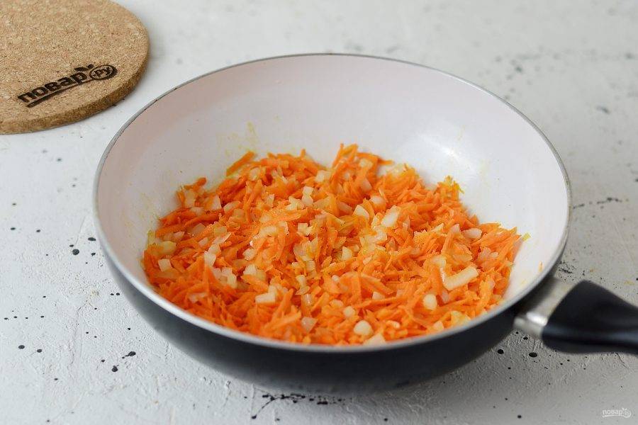 Репчатый лук нарежьте на мелкие кубики. Морковь натрите на крупной терке. Обжарьте овощи в масле до золотистого цвета. Затем прокрутите в мясорубке.
