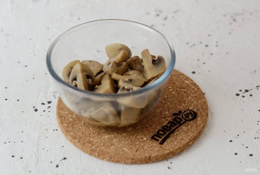 Шампиньоны помойте, нарежьте четвертинками и отварите 20 минут. Воду слейте.