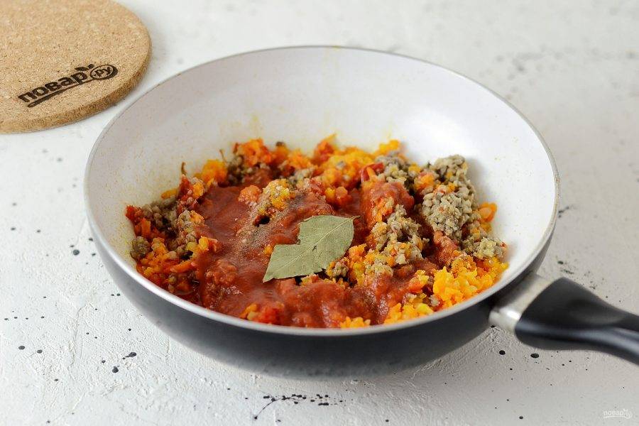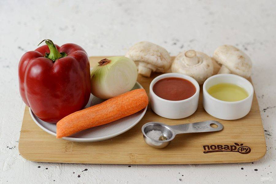 Соедините жареную морковь и лук, грибы и болгарский перец вместе. Добавьте томатный соус, соль, перцы и лавровый лист. Потушите все вместе 30 минут.