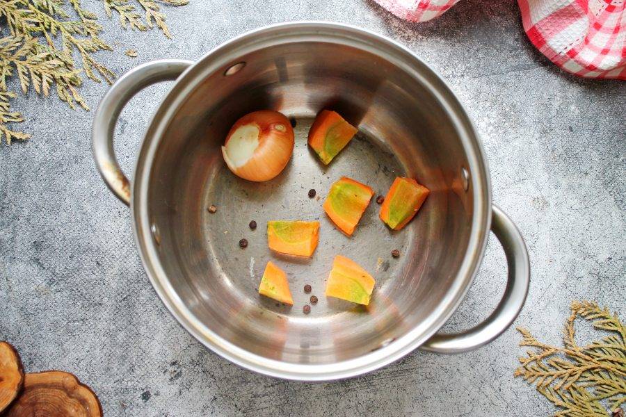 Морковь почистите, у репчатого лука отрежьте корешок, овощи сполосните. В кастрюлю выложите перец черный горошком, разрезанную морковь, репчатый лук.