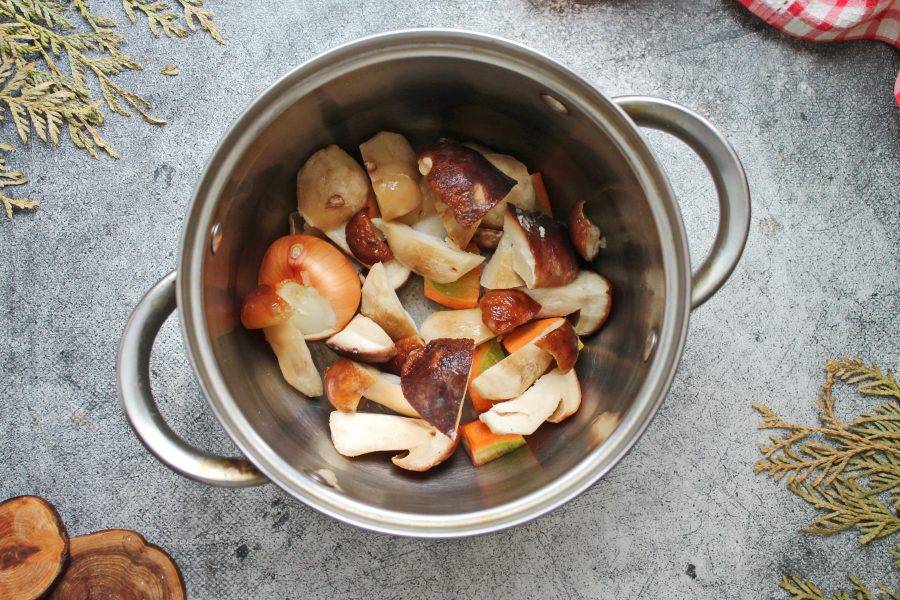 Подготовьте все необходимые ингредиенты для приготовления грибного бульона. Грибы, у меня белые, почистите, удалите места загрязнений, сполосните.