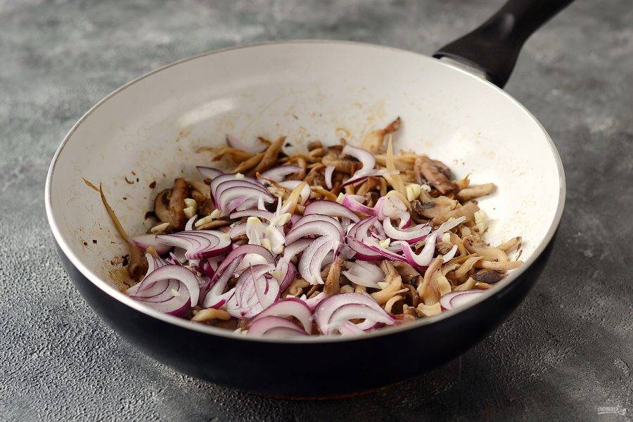 Лук нарежьте тонкими полукольцами, чеснок крупно порубите пластинами. Добавьте лук и чеснок к грибами. Посолите и поперчите немного. Сбрызните оливковым маслом. Обжарьте пару минут.