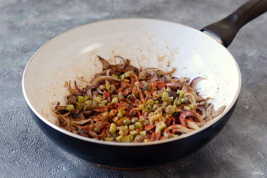Корнишоны крупно порубите. Добавьте в сковороду корнишоны, каперсы и паприку. Перемешайте.
