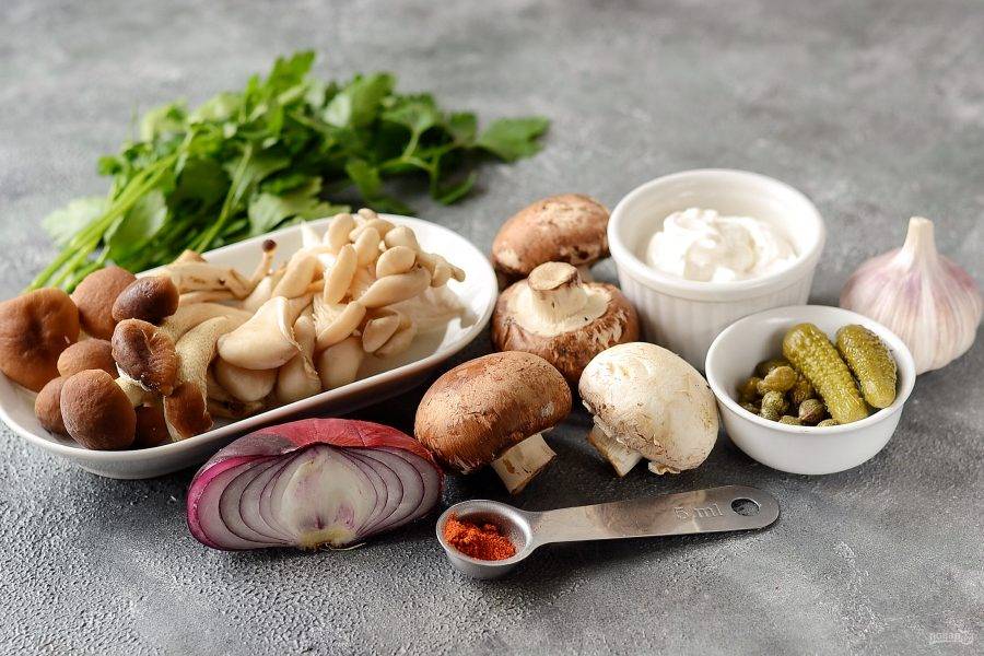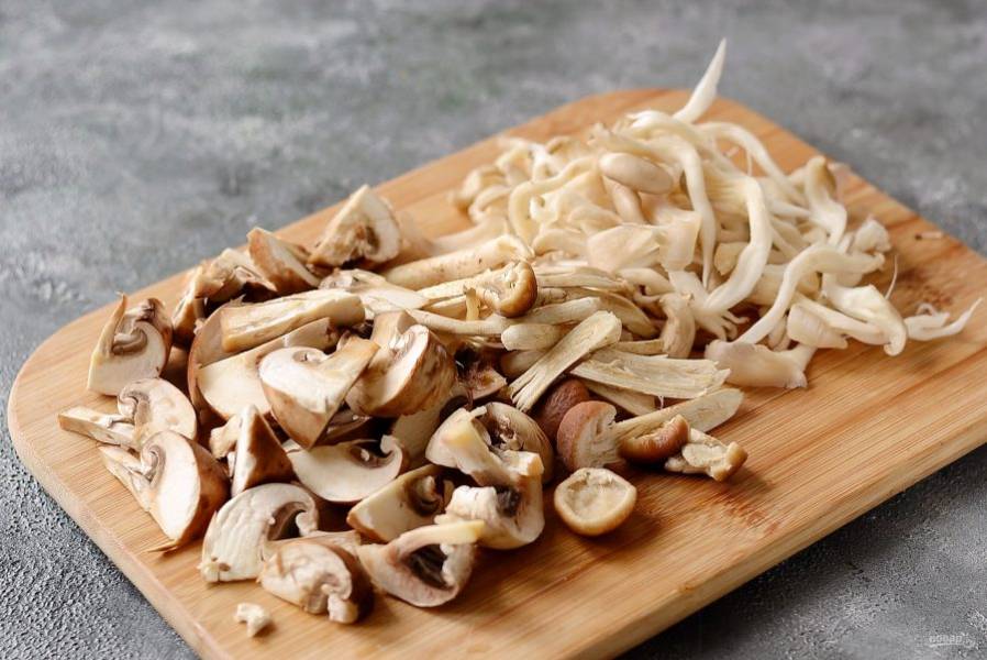 Грибы помойте и обсушите. Шампиньоны нарежьте крупными ломтиками, опята и вешенки разорвите руками.