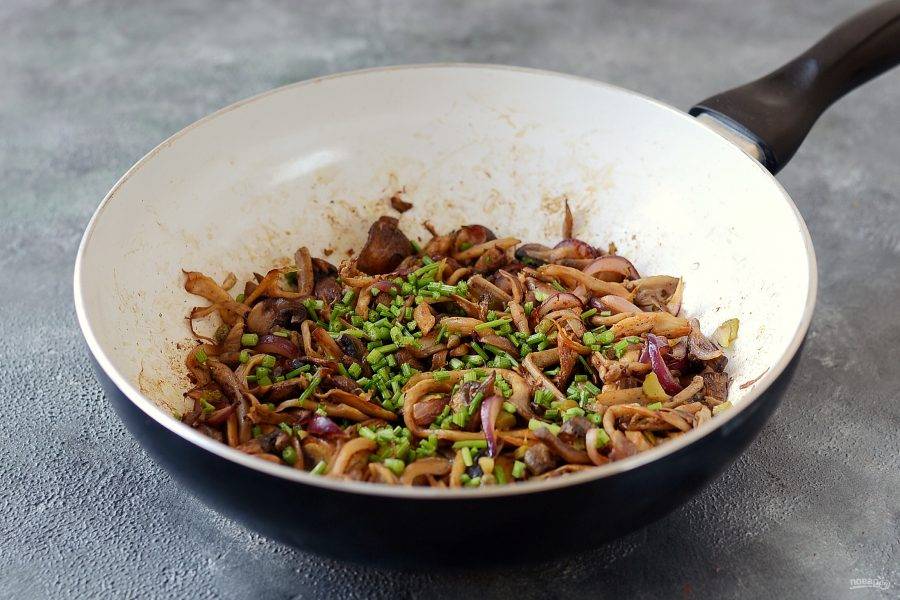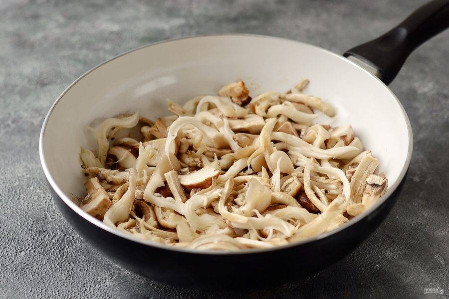 Разогрейте сковороду без масла и обжарьте грибы. Они должны хорошо подрумяниться. Если грибы будут выделять слишком много влаги, то слейте жидкость.