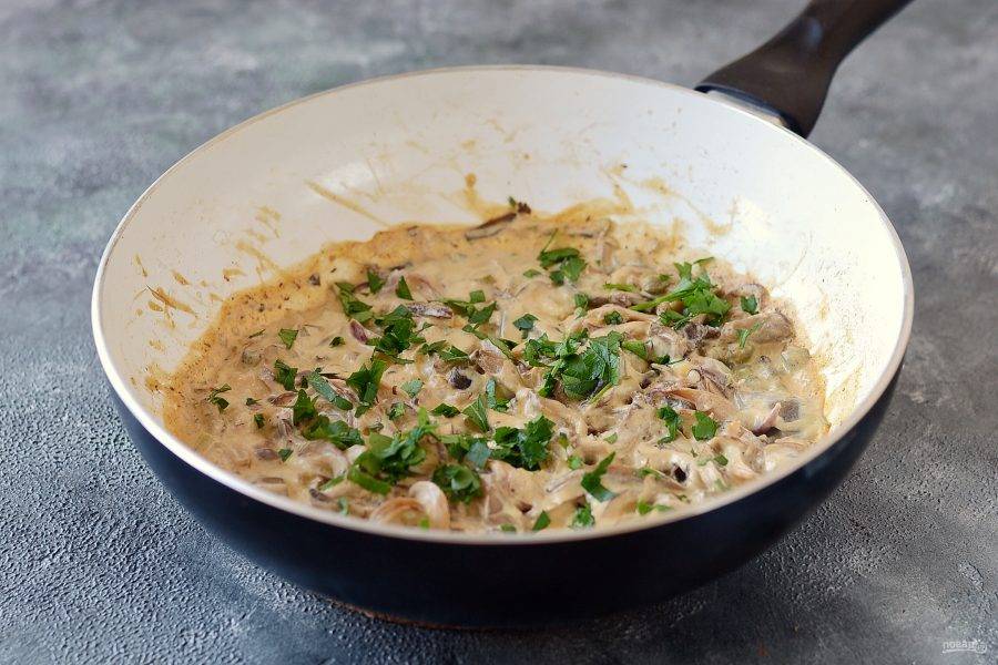 В конце добавьте сметану и немного воды до кремовой консистенции. Доведите до кипения, потушите 2-3 минуты. Добавьте измельченные листья петрушки в сковороду.