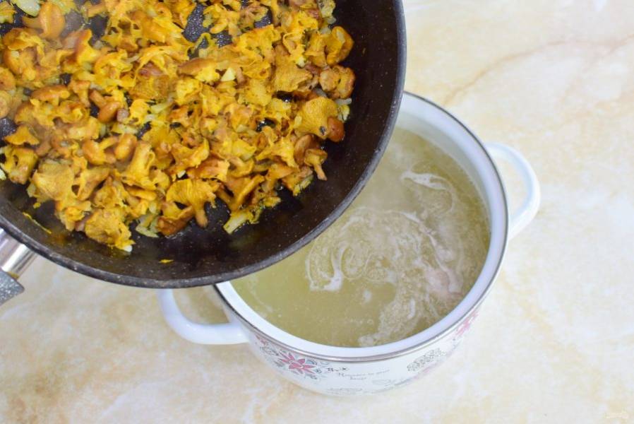 Затем отправьте грибную поджарку в кастрюлю с супом. По вкусу добавьте соль и специи. Проварите суп еще 3-5 минут и снимите кастрюлю с огня.