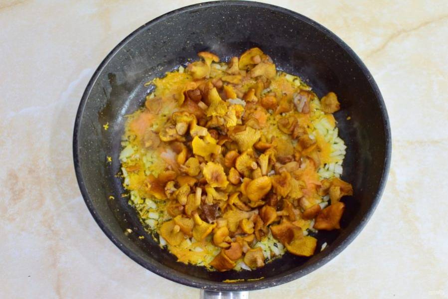 Затем добавьте в сковороду лисички. Обжарьте все вместе еще 2-3 минуты, чтобы из грибов выпарилась жидкость.