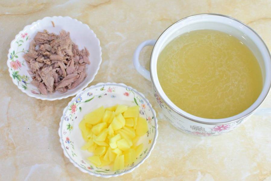 Бульон поставьте на огонь и доведите до кипения. Отправьте в него мясо и картофель, нарезанный на кусочки. Оставьте вариться на 10-15 минут.