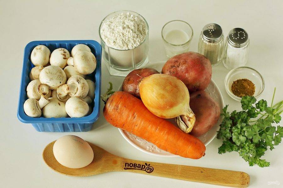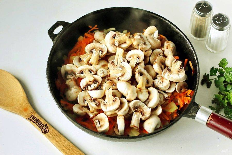 Параллельно этому процессу, налейте в кастрюлю воду и доведите до кипения. Отдельно на сковороде обжарьте нарезанный кубиками лук и тертую морковь. В конце добавьте нарезанные шампиньоны и жарьте все вместе до испарения жидкости.