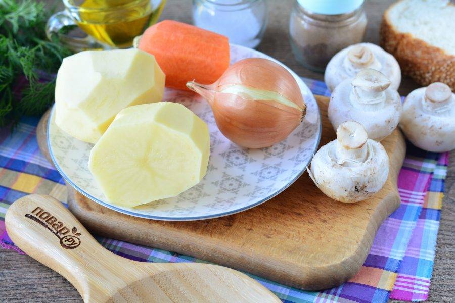 Наваристый и ароматный грибной суп с сухариками понравится каждому. Сухарики приготовьте самостоятельно, пожарьте в сковороде. Такой суп подходит для постного меню.