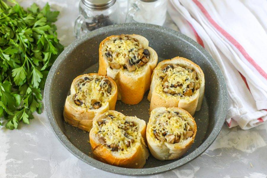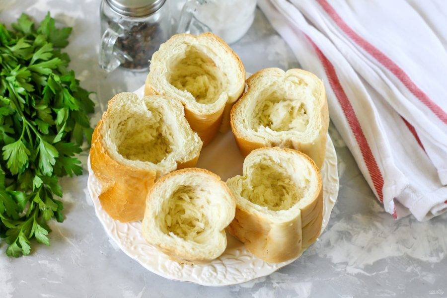 Нарежьте багет на части высотой около 6-8 см. Аккуратно извлеките из них мякиш, оставляя немного хлеба на дне.