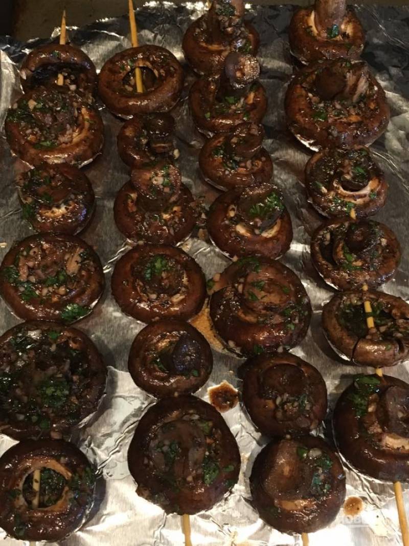 Насадите грибочки на шампуры. Отправляйте жариться на среднем огне, не забывая их переворачивать каждые 4-5 минут.