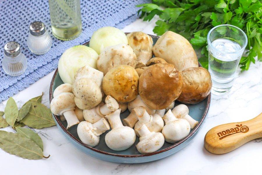 Подготовьте указанные продукты. Грибы промойте в воде, удаляя пыль и грязь, срежьте подпорченные места. Сорт грибов может быть любой.