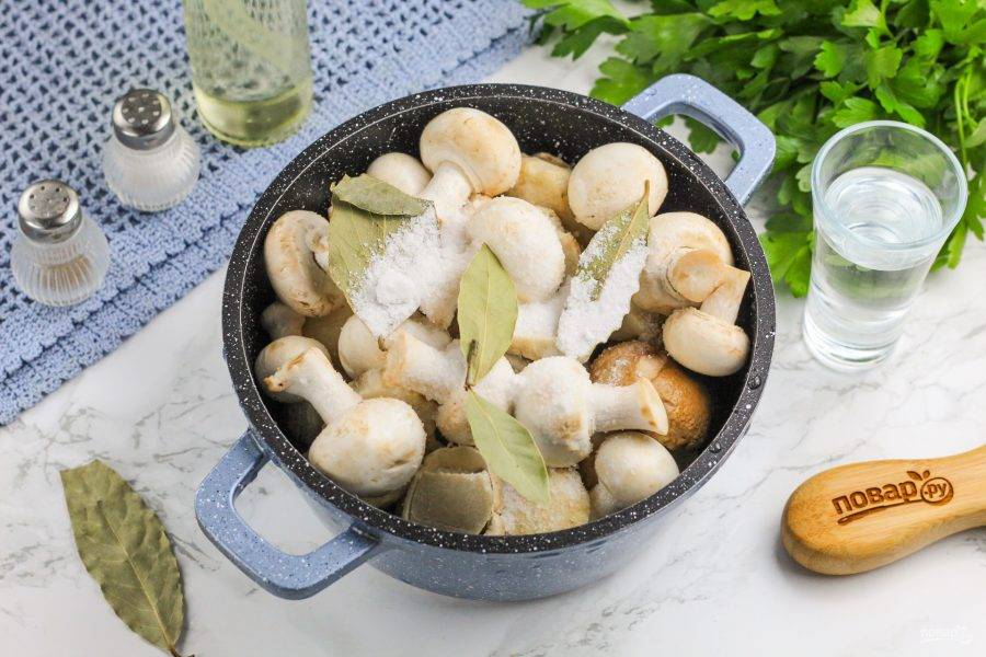 Всыпьте соль и добавьте лавровые листья. По желанию допустимо всыпать и пару горошин черного перца, но не душистого, чтобы он не перебил грибной аромат.