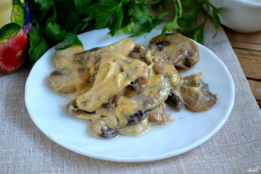 Переложите грибы под сырным соусом в небольшую тарелку, украсьте зеленью и немедленно несите к столу. Это блюдо я советую готовить непосредственно перед подачей, чтобы сыр остался мягким и тягучим.