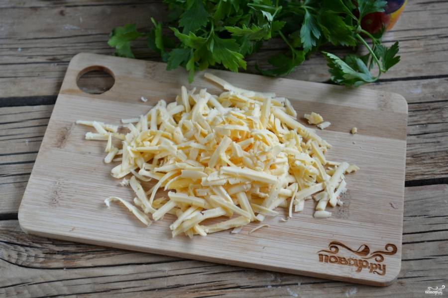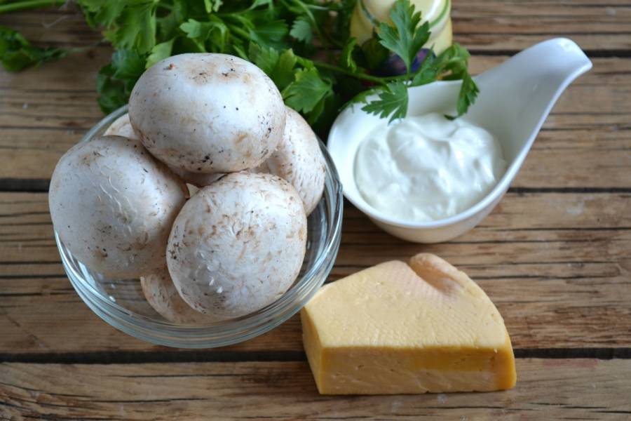 Подготовьте все необходимые ингредиенты. Шампиньоны выбираейте покрупнее, чтобы при нарезании получились тонкие, но большие пластины. Сыр советую брать тот, который хорошо плавится, а в расплавленном состоянии тянется. Можете взять моцареллу, она тоже хорошо подойдет.