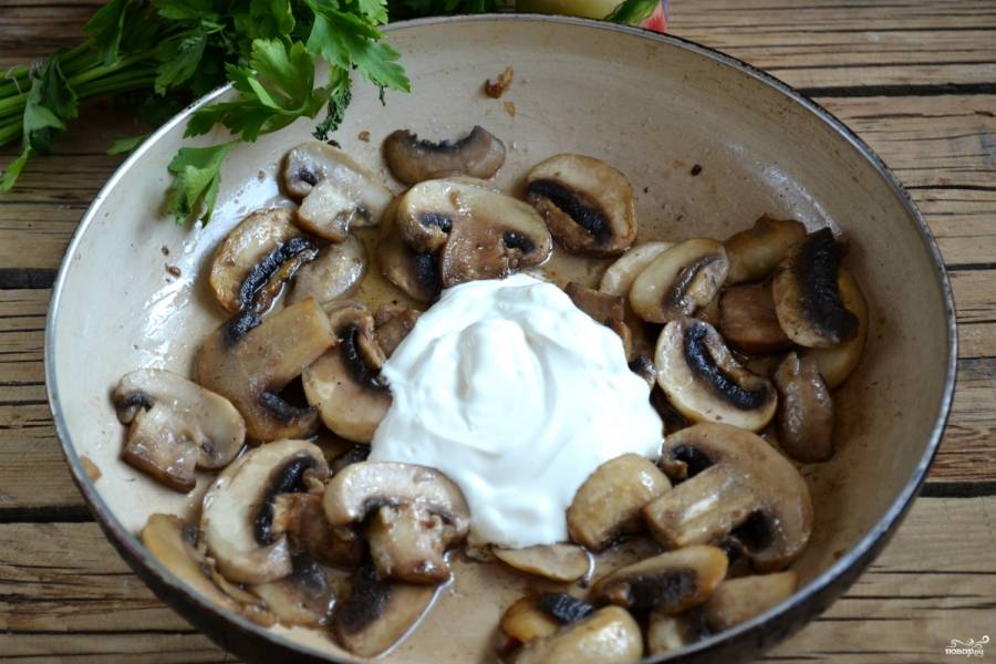 Грибы обжарьте в 2 ст. ложках растительного масла до характерного золотистого цвета и волшебного аромата, затем добавьте сметану и готовьте 4-5 минут, постоянно помешивая. Жидкость, содержащаяся в сметане, за это время должна испариться.