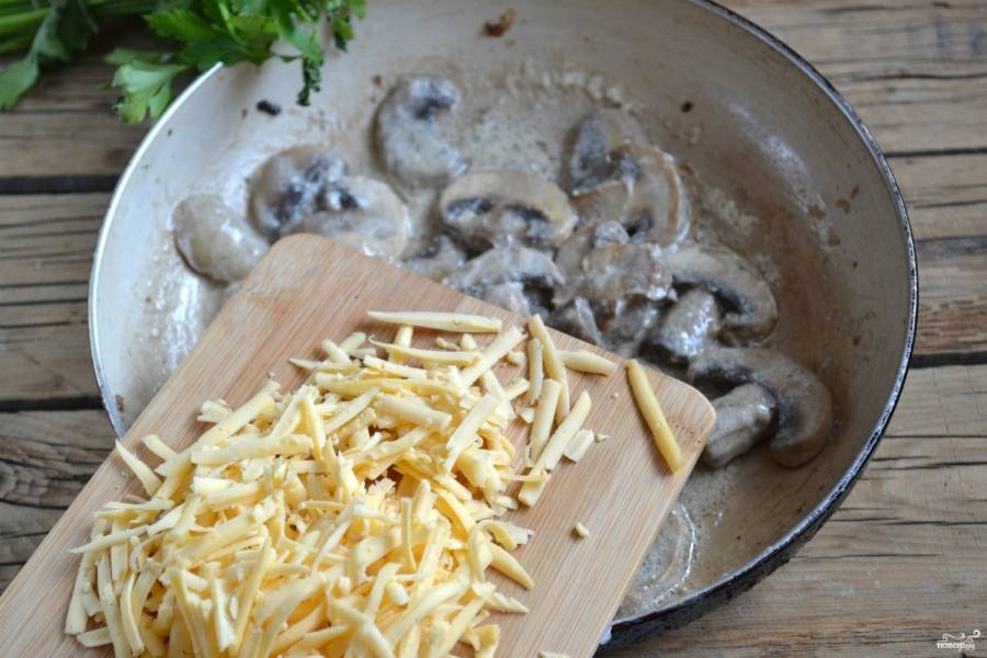 Всыпьте сыр, готовьте буквально несколько минут, как только он полностью расплавится и станет тягучим, обволакивая каждый грибочек, блюдо можно считать готовым.