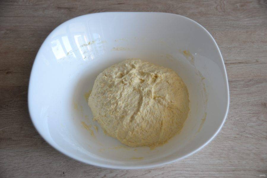 Соберите тесто в шар, накройте пищевой пленкой, поставьте в теплое место для брожения примерно на 1,5 часа.