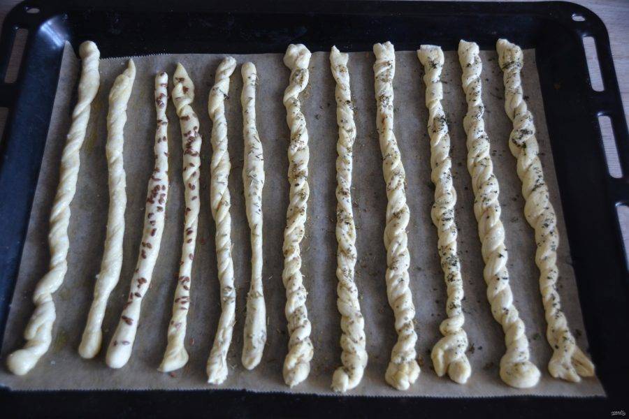 Посыпьте "гриссини" подготовленными семенами и травами. Разогрейте духовку до 200 градусов.