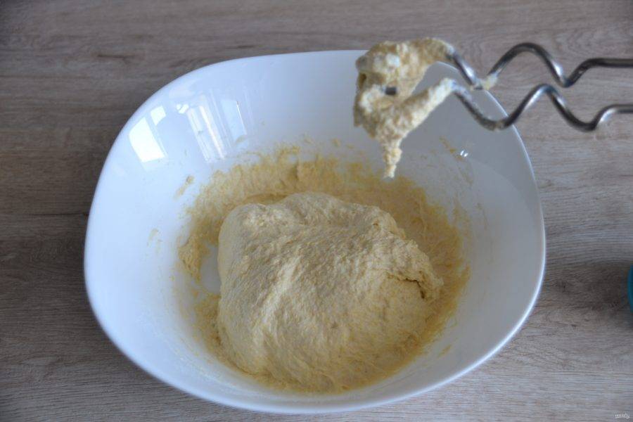 Всыпьте смесь сухих ингредиентов, замесите тесто.