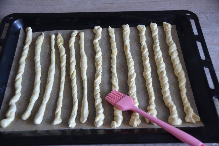 Раскатайте одну часть теста в пласт, нарежьте на полоски. Скатайте полоски в жгутики.