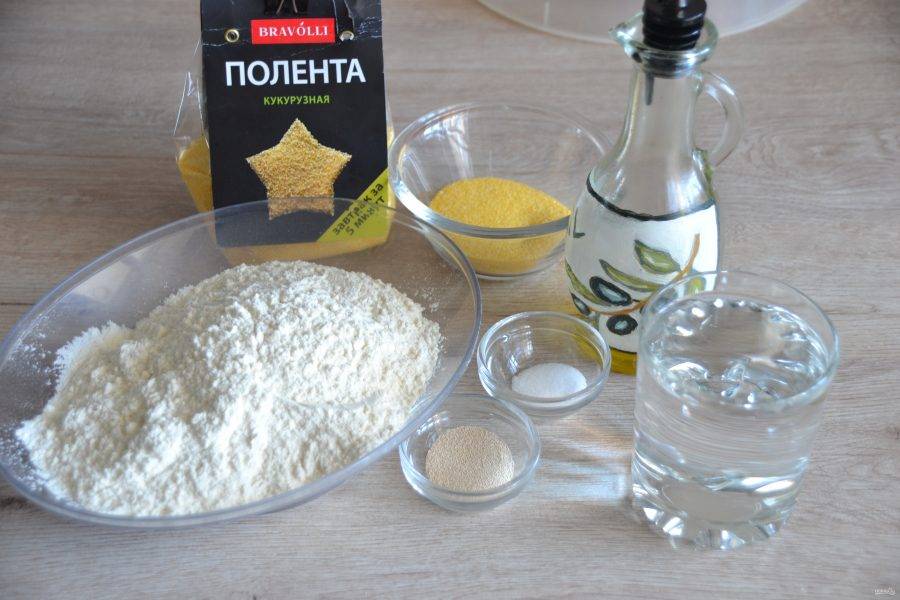 Смешайте все сухие ингредиенты: муку, кукурузную поленту "Bravolli", соль, сухие дрожжи.