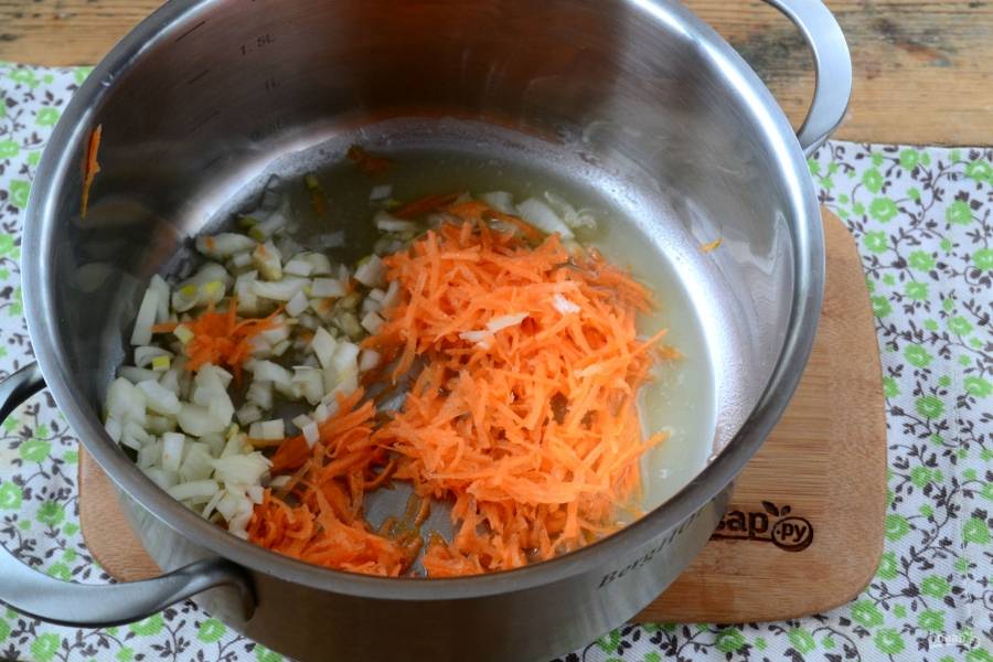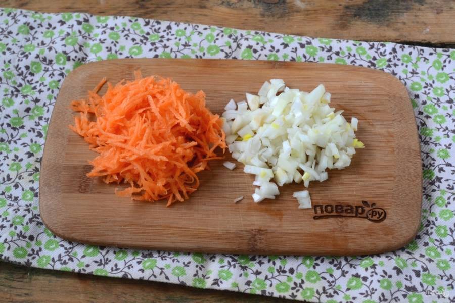 Морковь натрите на мелкой терке, луковицу порежьте как можно мельче.