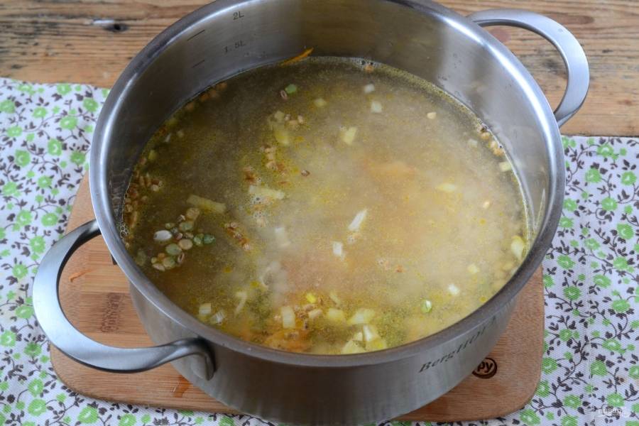 Всыпьте фасоль, горох, перловку, добавьте соль по вкусу. Залейте все это водой так, чтобы та покрыла продукты на 2 пальца. Готовьте под крышкой на медленном огне в течение 50-60 минут.