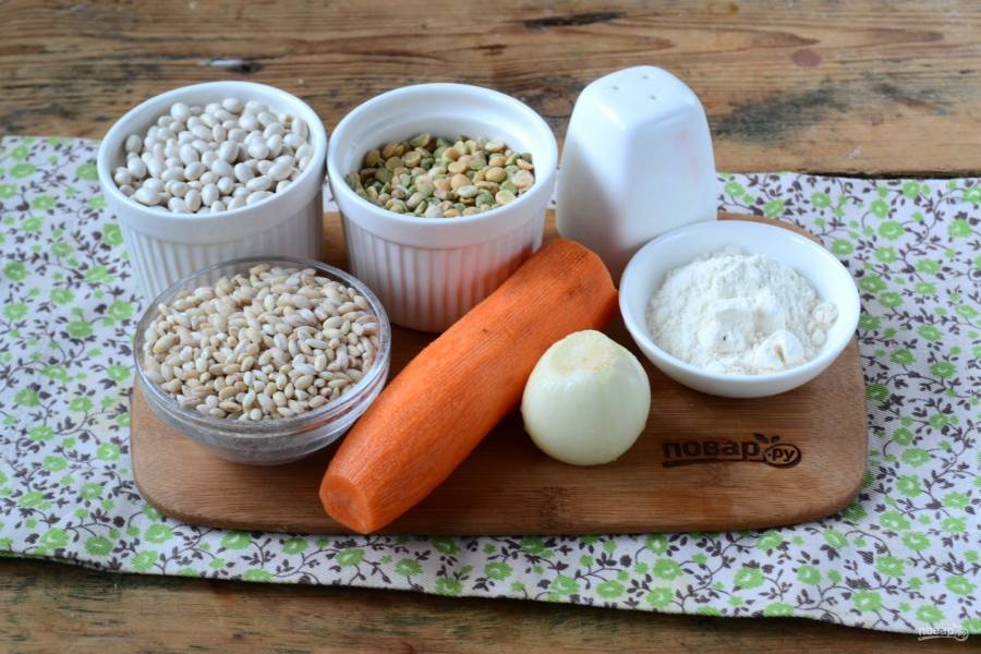 Подготовьте все необходимые ингредиенты. Фасоль и горох предварительно замочите в холодной воде на 2 часа или на ночь.