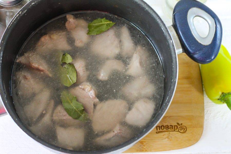 Затем влейте в емкость горячую воду, всыпьте лавровые листья и потушите мясо примерно 30 минут на умеренном нагреве до выкипания воды.