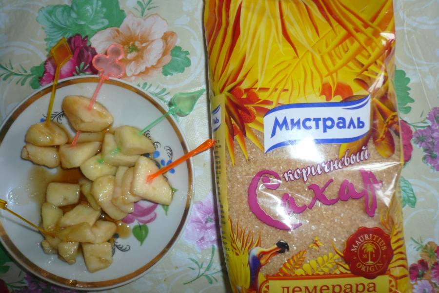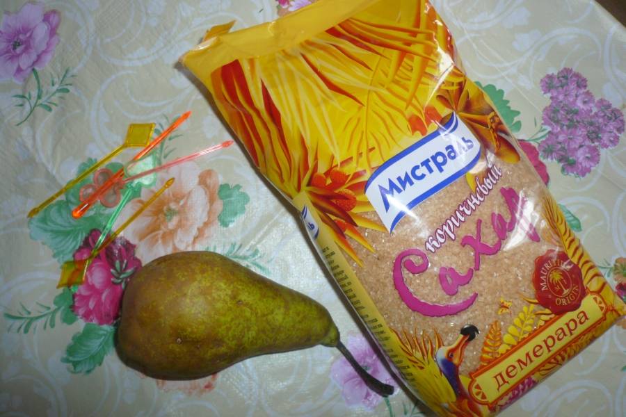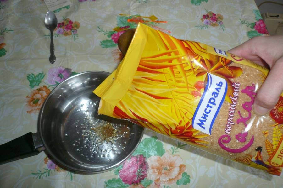 Сахар "мистраль" тростниковый нерафинированный коричневый и воду, добавляем в кастрюлю
