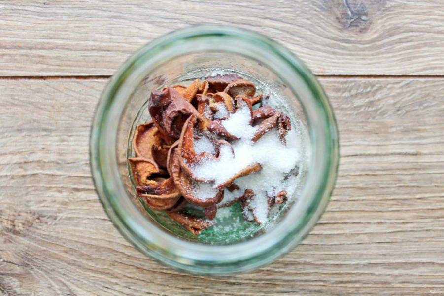 В чистую сухую банку выложите сушеную грушу и всыпьте сахар.