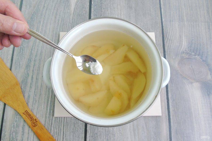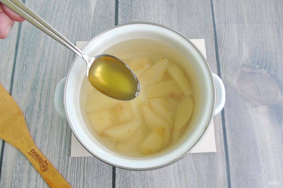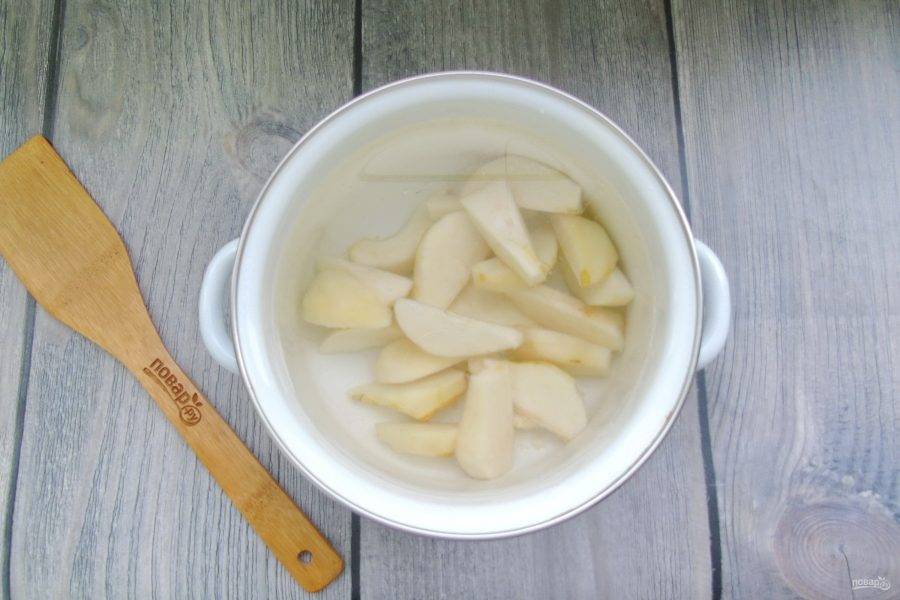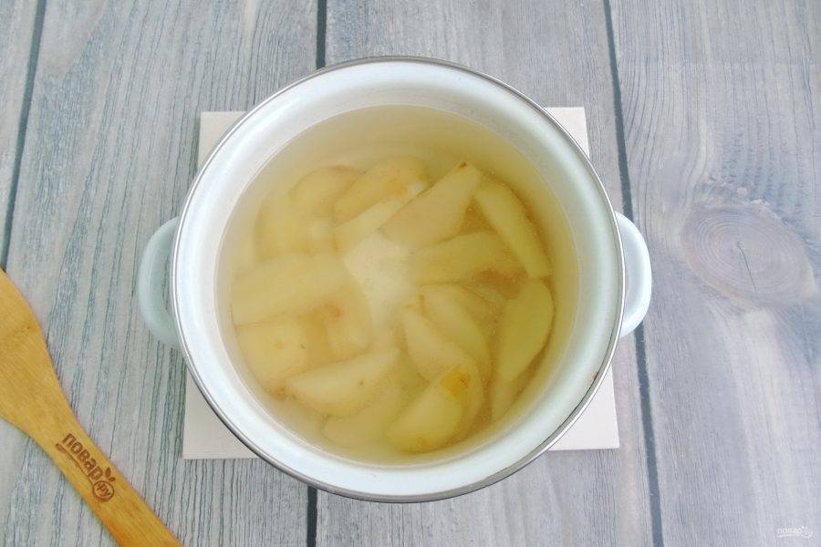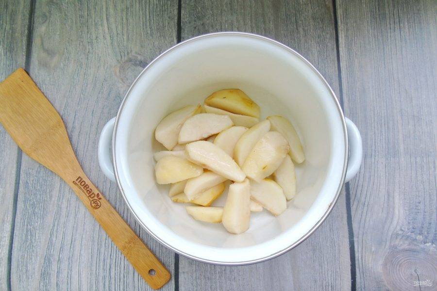 Груши помойте, очистите, удалите сердцевину, нарежьте дольками и выложите в кастрюлю.