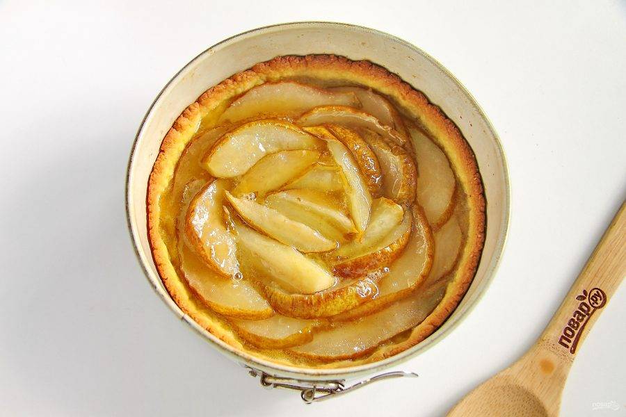 Когда будет видно, что пирог почти готов - достаньте его. Груши полейте равномерно соком, который остался после тушения на сковороде.