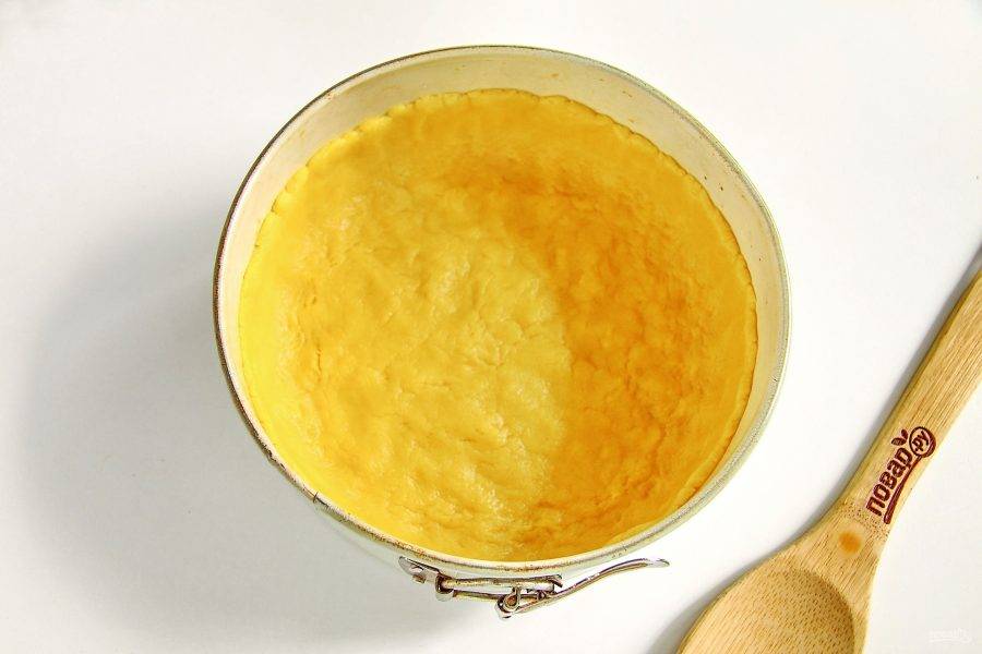 Форму для выпечки смажьте маслом и распределите тесто по форме руками, формируя высокие бортики.