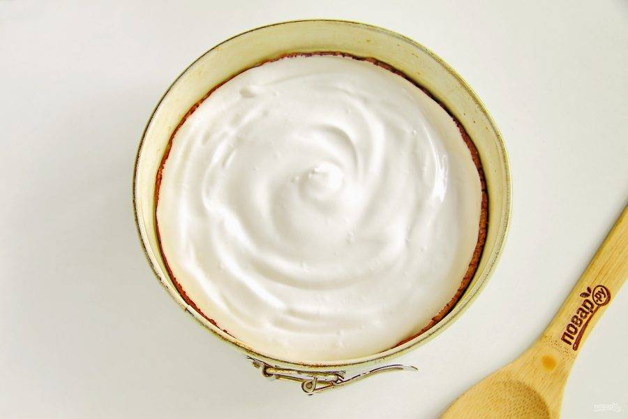 Охлажденные белки взбейте с сахаром до устойчивых пиков и распределите их сверху. Отправьте пирог снова в духовку и готовьте еще примерно 15-20 минут, до румяного верха.