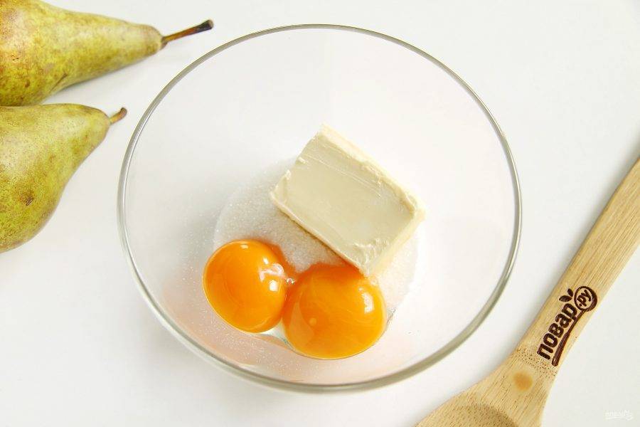 В глубокой миске соедините мягкое сливочное масло, сахар и два желтка (белки уберите пока в холодильник, они понадобятся чуть позже).