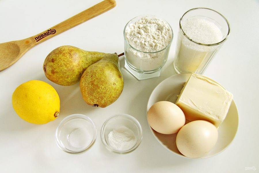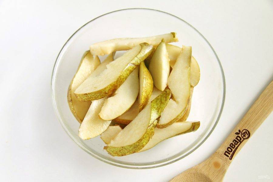 Груши помойте, уберите сердцевину и нарежьте дольками. Сбрызните соком лимона, чтобы груши не потемнели.