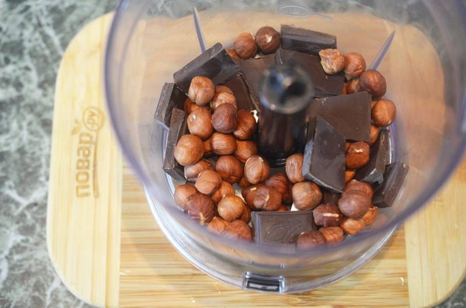 Шоколад поломайте на кусочки, положите в чашу блендера вместе с орехами. Измельчите.
