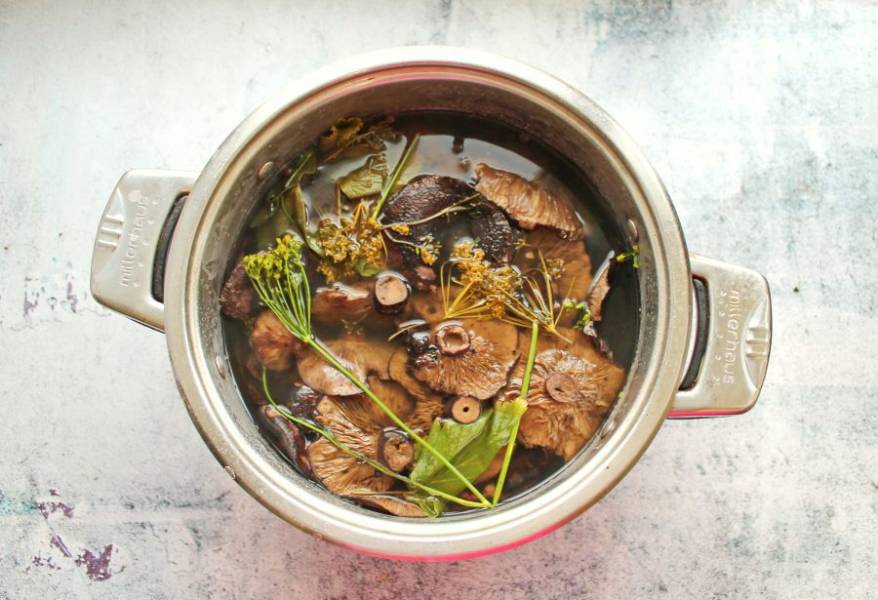 Выложите в рассол отварные грибы и варите в течение 30 минут. Снимите с огня и полностью остудите.